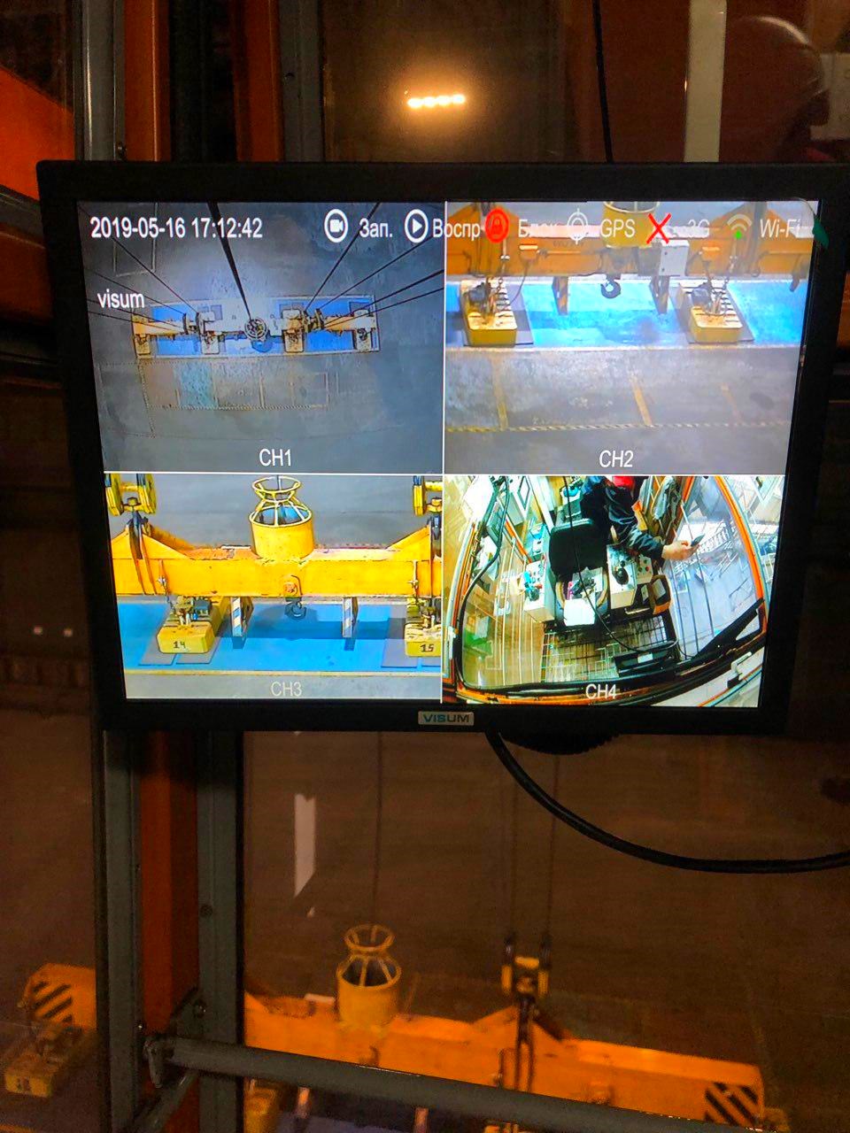 Изображение с видеокамер выводится в режиме реального времени на мониторе, установленном в кабине оператора крана. На монитор можно вывести как каждую камеру в отдельности, так и все камеры одновременно. Переключение осуществляется при помощи консольного переключателя. Дополнительно ведется запись всех видеоданных на видеорегистратор, для обеспечения возможности анализа данных в нештатных ситуациях. Принципиальная схема подключения оборудования приведена ниже.